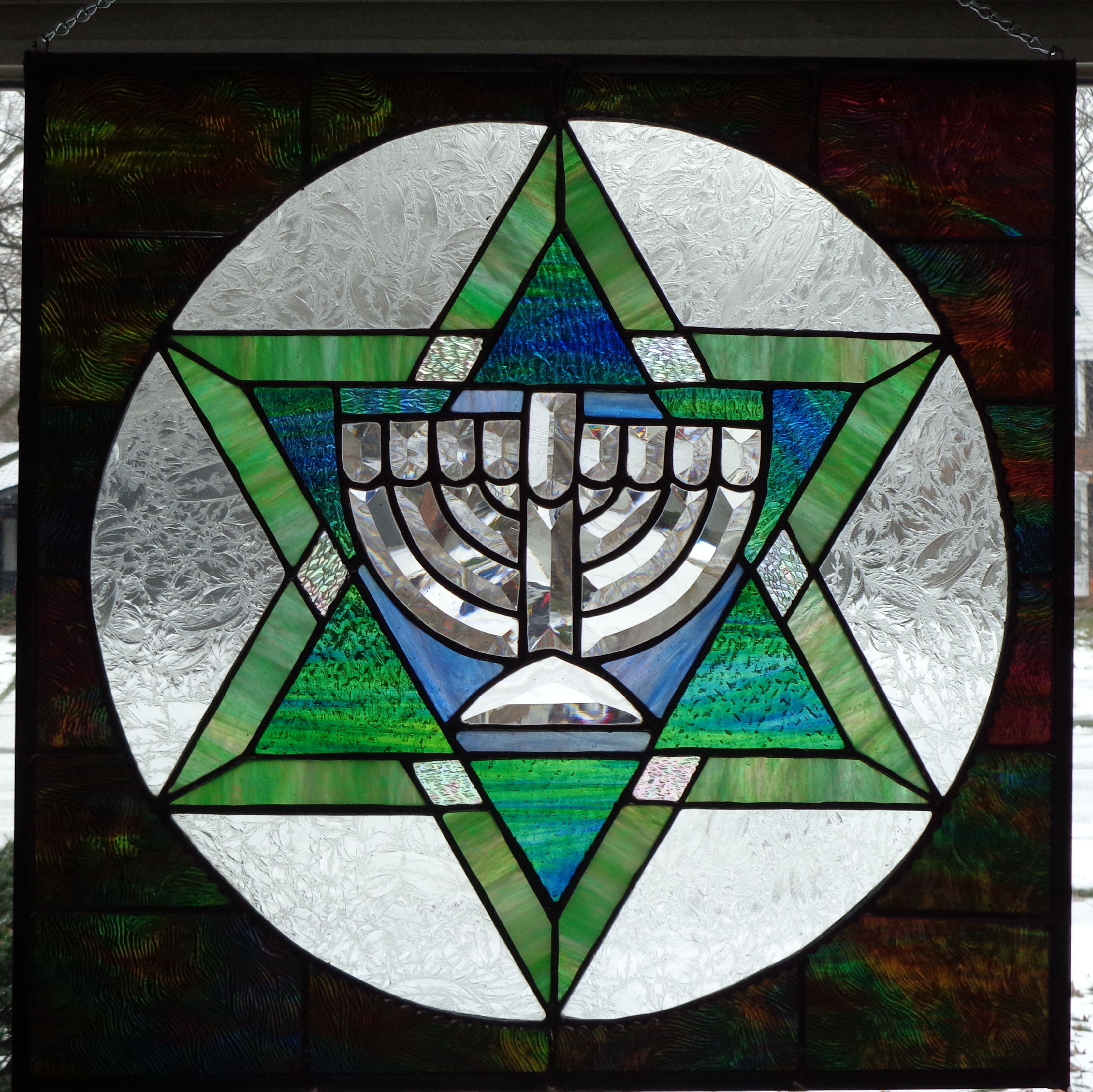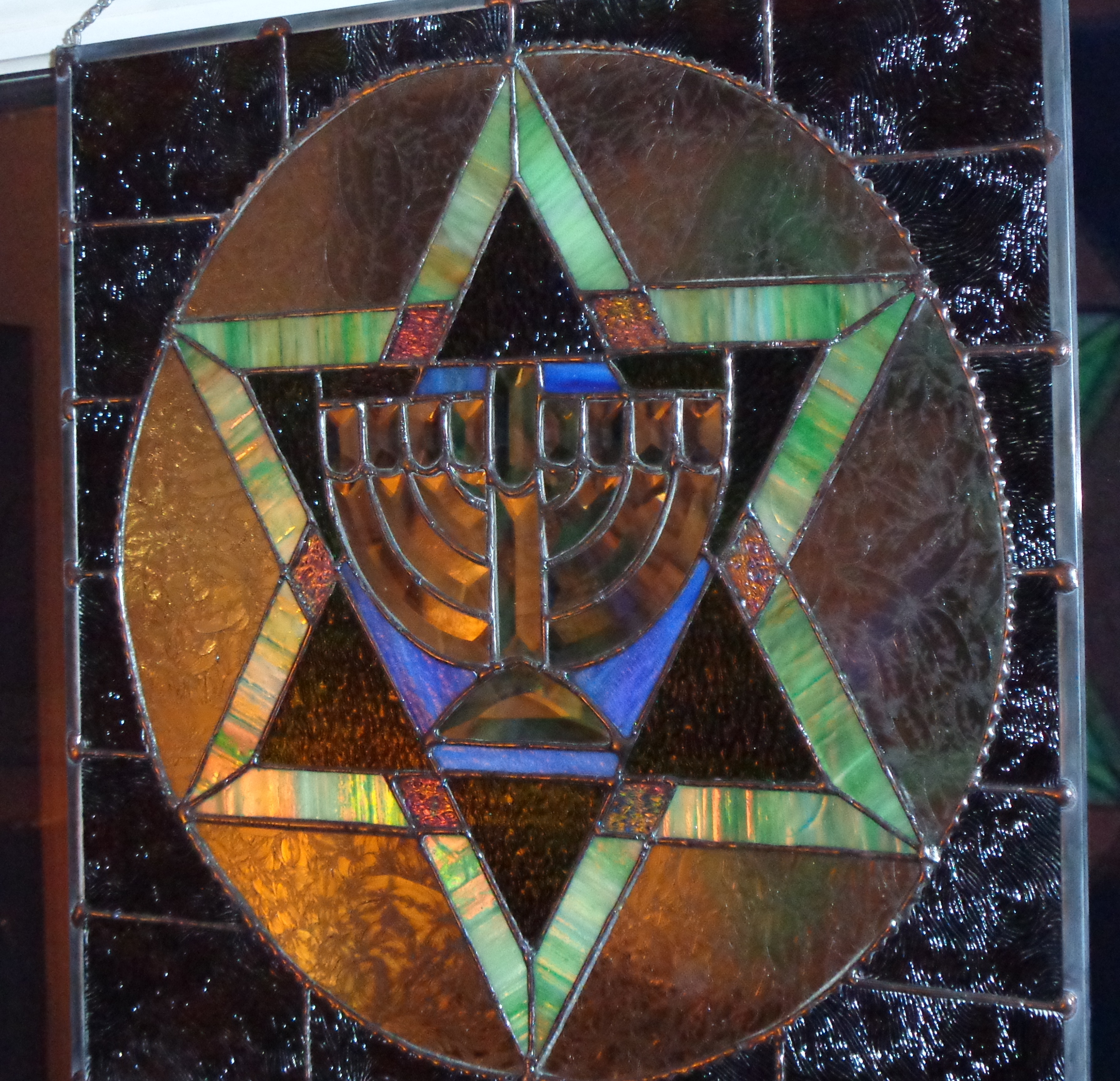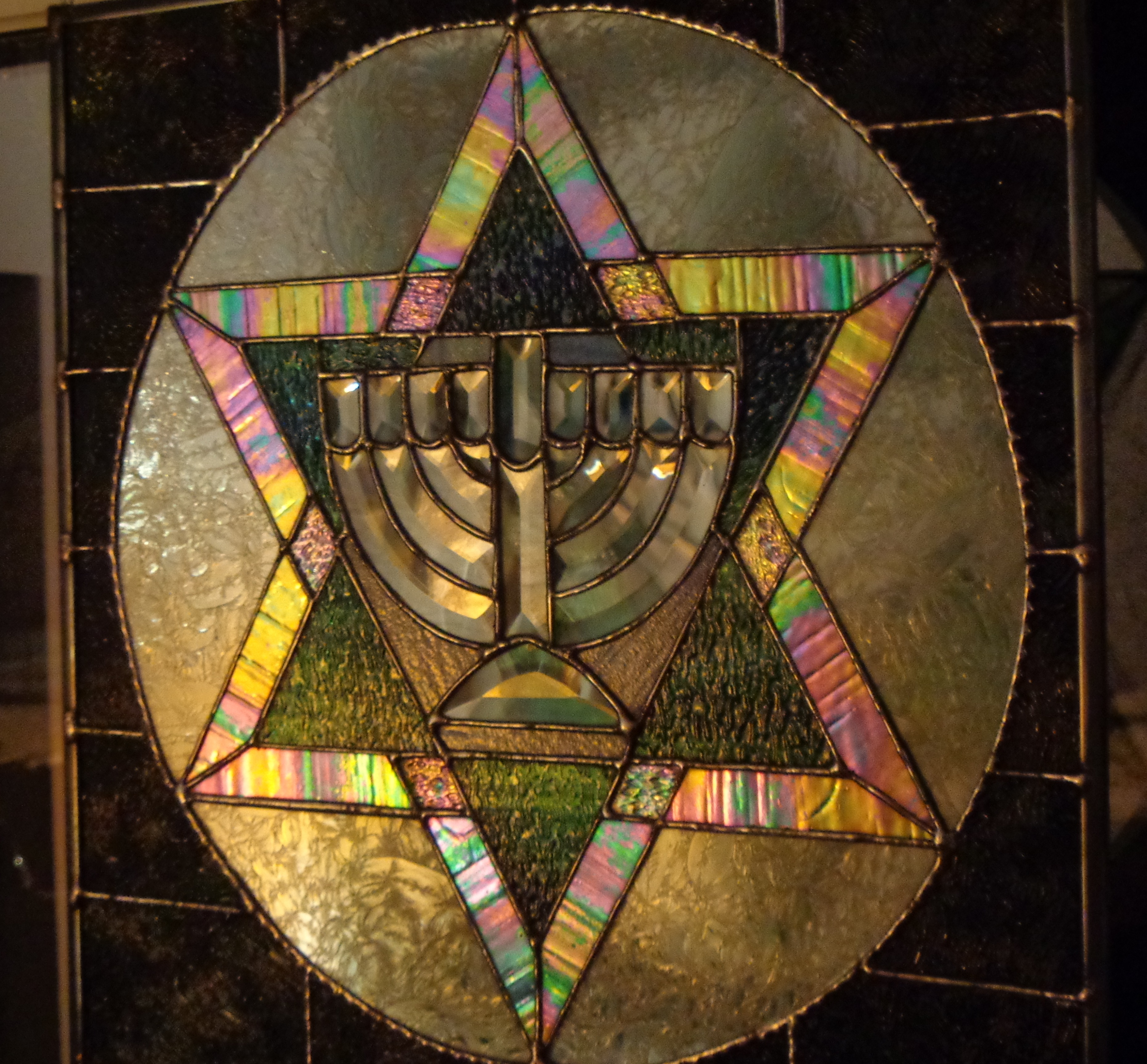 Magain David — The Star of David I love the way the light plays with the glass in this piece. The contrast between daylight and night is absolutely striking! Share this: Click to share on Facebook (Opens in new window) Facebook Click to share on X (Opens in new window) X Like Loading... Related January 14, 2014April 27, 2014 by ronsglass Categories: UncategorizedTags: Abstract stained glass, beveled glass, Chanukah beveled glass, Chanukah stained glass, Hannukah, Hebrew glass, Hebrew stained glass, holiday stained glass, Jewish Art, Jewish stained glass, Magain David, Menorah, Menorah beveled glass, menorah stained glass, Ron Sussman, Ron's Glass, ronsglass, Sabbath, Shabbat, Shabbat stained glass, stained glass chanukah, star of david, www.ronsglass.wordpress.com Leave a comment