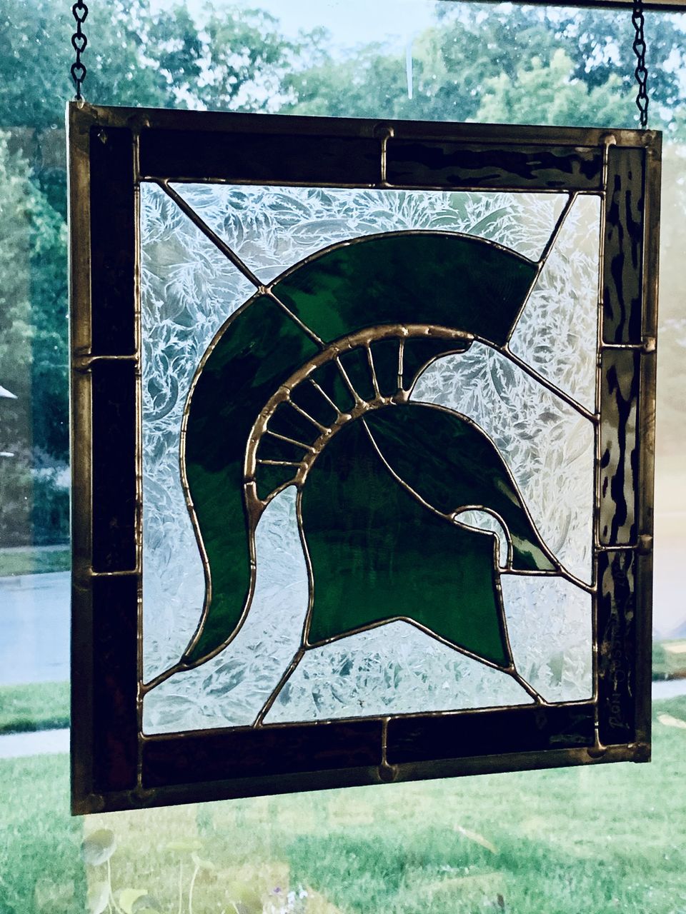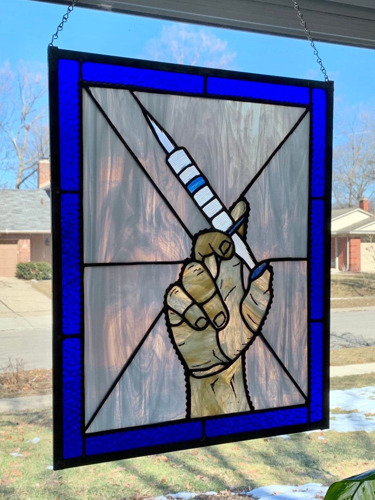 People seem to appreciate when I present a mnemonic device to remember the Hebrew letter. In this glass I intertwined the letter “B” with the letter “BEIT”.